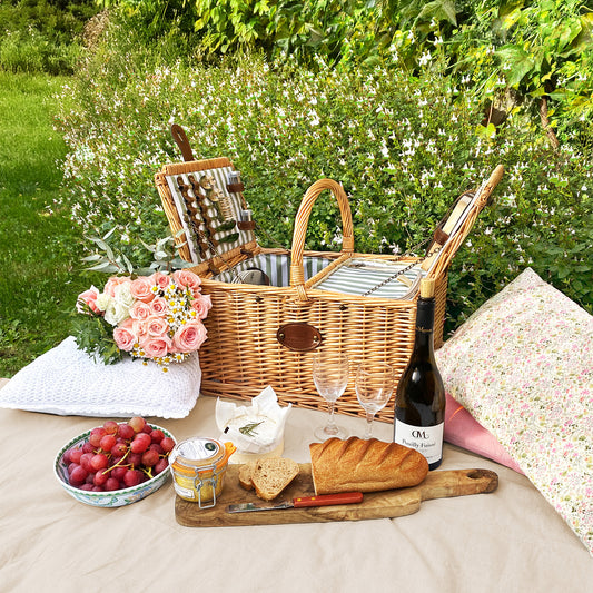 Cestini e zaini da picnic in vimini naturale venduti con tutto il necessario per un picnic (stoviglie, bicchieri, posate, ecc.) per 2, 4 o 6 persone. La maggior parte dei nostri cestini è dotata di uno scomparto isolato.