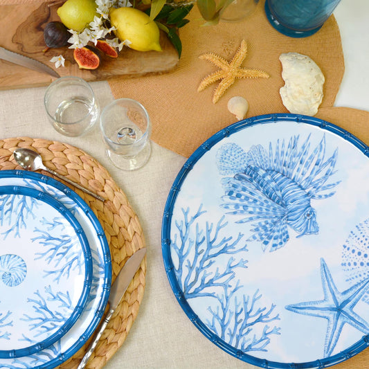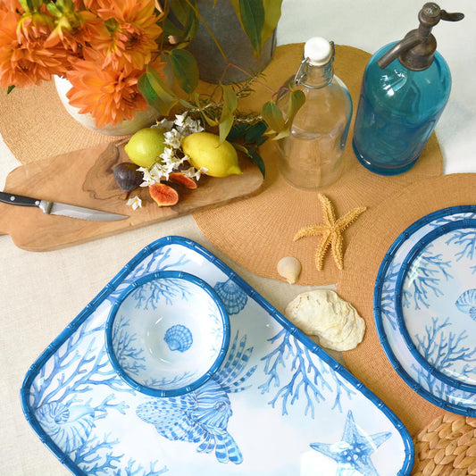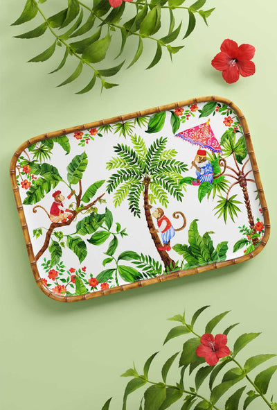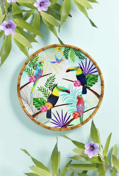 Stoviglie in melamina colorata stampate con Capri, Giungla, Caraibi, Pappagalli di Bahia, Tucani di Rio, Fiori esotici e Scimmie di Bali. Tutti questi temi impreziosiscono qualsiasi tavola. Ideale per la tavola estiva o invernale, per ambienti interni ed esterni.