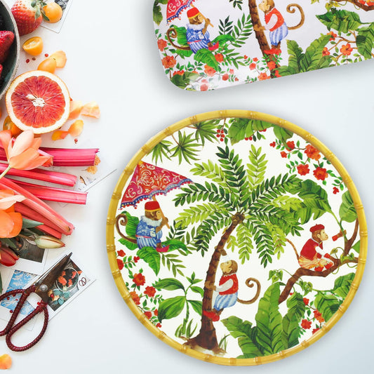 Stoviglie in melamina colorata stampate con Capri, Giungla, Caraibi, Pappagalli di Bahia, Tucani di Rio, Fiori esotici e Scimmie di Bali. Tutti questi temi impreziosiscono qualsiasi tavola. Ideale per la tavola estiva o invernale, per ambienti interni ed esterni.