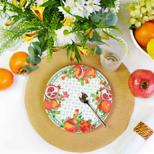 Lasciati trasportare nel cuore dei giardini andalusi con la nostra nuova collezione di stoviglie in melamina "Siviglia", parte della MelARTmine Collection. Ispirata ai sontuosi palazzi moreschi e ai cortili fioriti del sud della Spagna, questa collezione illuminerà la tua tavola con motivi di melograni generosi, fiori colorati e fogliame scintillante.