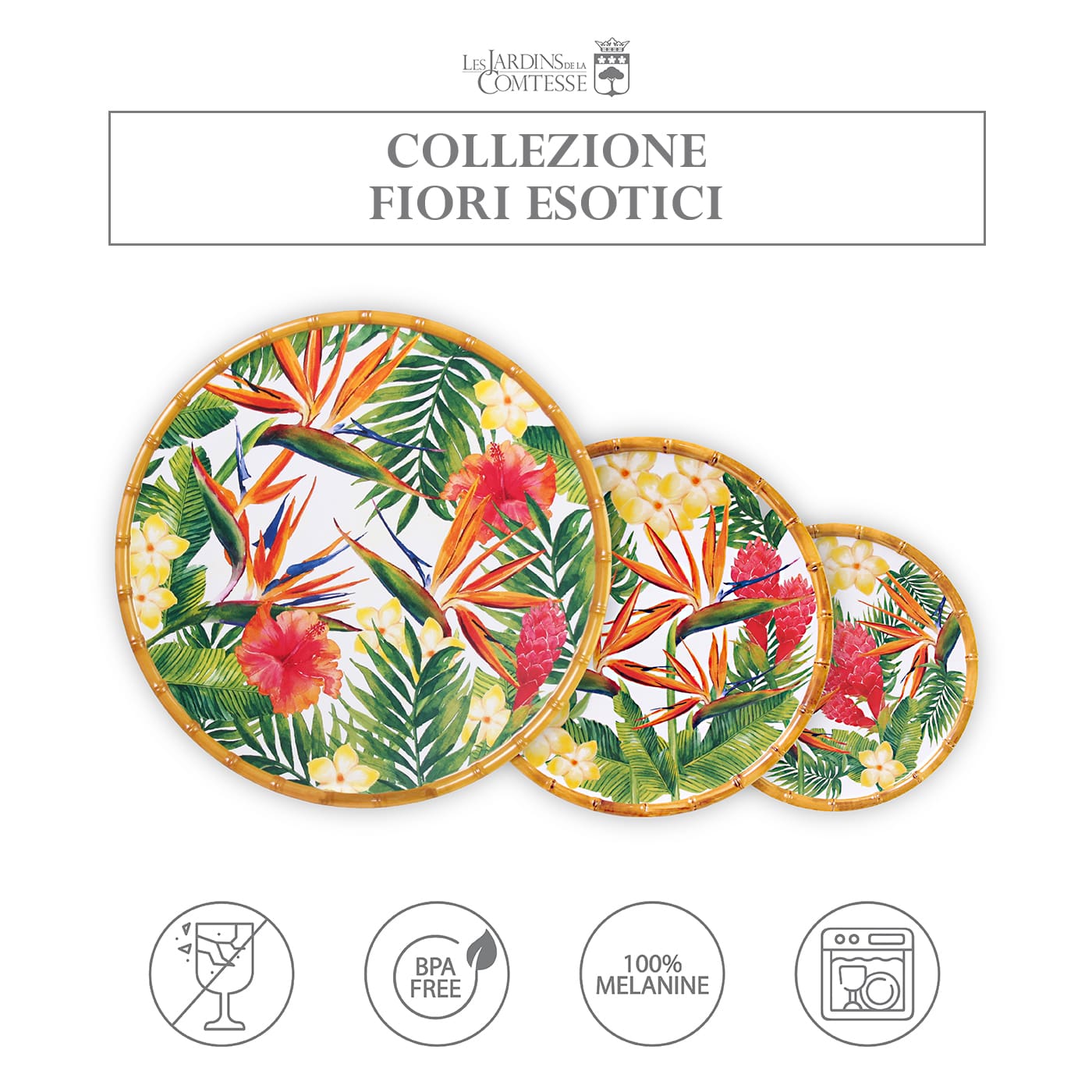 Finalmente un piatto di servizio di design grande e molto resistente! Scegli questo piatto tondo grande in pura melamina per servire formaggi, frutti di mare, insalate e desserts. La finitura effetto bambů con Fiori Esotici lo rende particolarissimo. Non dovrai piů temere di sbeccare o rompere le tue stoviglie. Realizzato in pura melamina di alta qualitŕ, questo piatto č praticamente indistruttibile. Scegli questo grande piatto resistente e bello come la ceramica, ma senza la sua fragilitŕ! Messo a centro tavola, questo piatto tondo grande donerŕ freschezza alla decorazione della tua tavola con i suoi colori e motivi esotici. Potrai abbinare questo piatto ai coperti da insalata della stessa collezione per completare il tuo servizio.La serie Fiori Esotici include piatti piani grandi e piccoli, insalatiera grande, insalatiera fonda, coperti da insalata, piatto da servizio tondo piatto ottogonale, piatto da portata grande. Si lava facilmente in lavastoviglie senza perdere il colore. Potrai scegliere se avere un servizio con un unico motivo, o se abbinare con i pezzi verdi o rosso corallo della collezione Tinta Unita. Per conservare i vostri piatti il piů a lungo possibile, č preferibile non usare coltelli con denti troppo pronunciati (per esempio coltelli da bistecca) per evitare di graffiare il materiale.